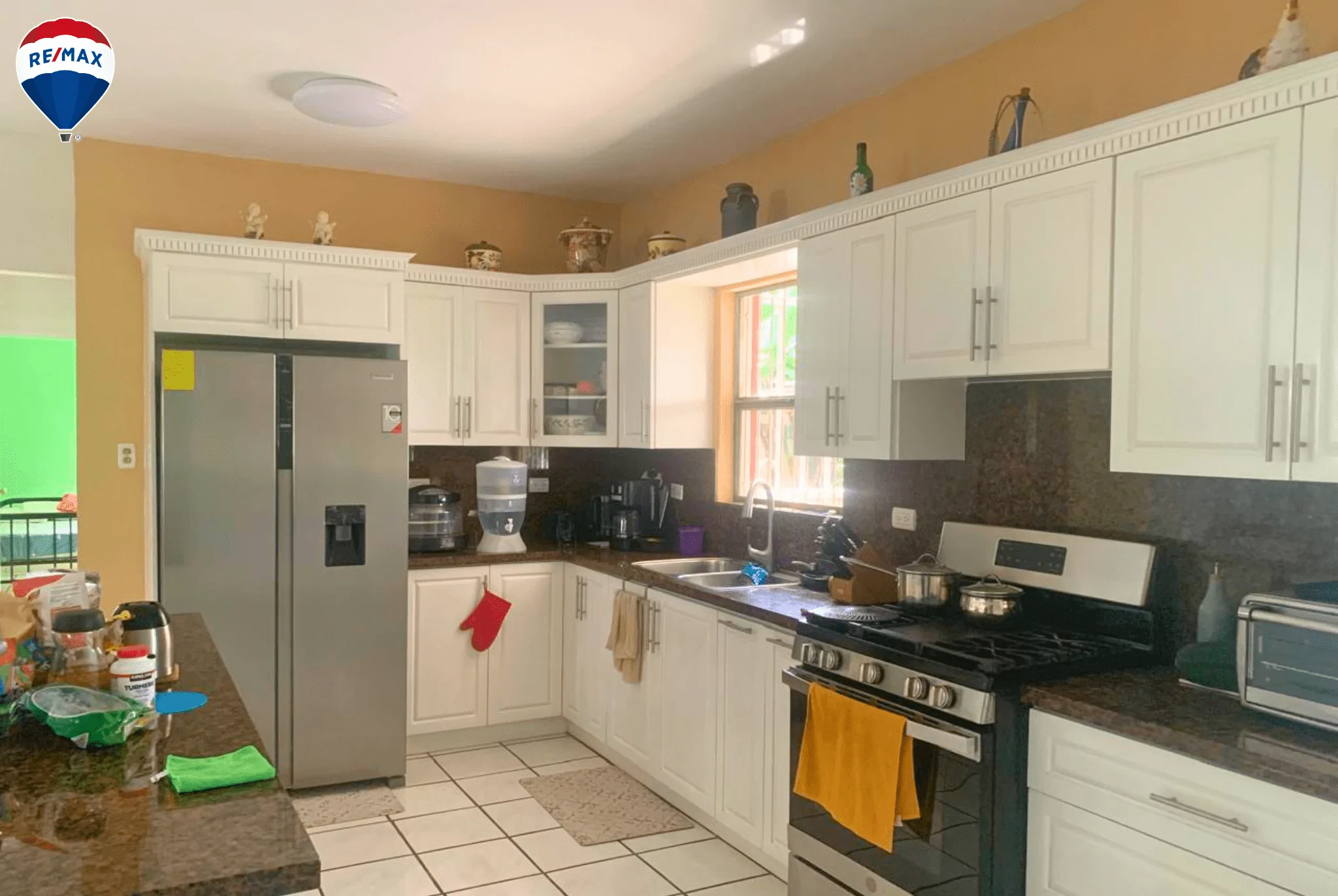 Las otras dos recámaras cuentan con clósets propios, abanicos de techo, y comparten un mismo baño. Por su parte, la terraza ofrece el lugar ideal para relajarte mientras contemplas los frondosos árboles frutales de la propiedad: cítricos, plátanos, cocoteros y más. Entre los espacios adicionales de la propiedad, destacan un estudio u oficina, un cuarto de servicio con baño independiente, área de lavandería y garaje techado con capacidad para dos vehículos.