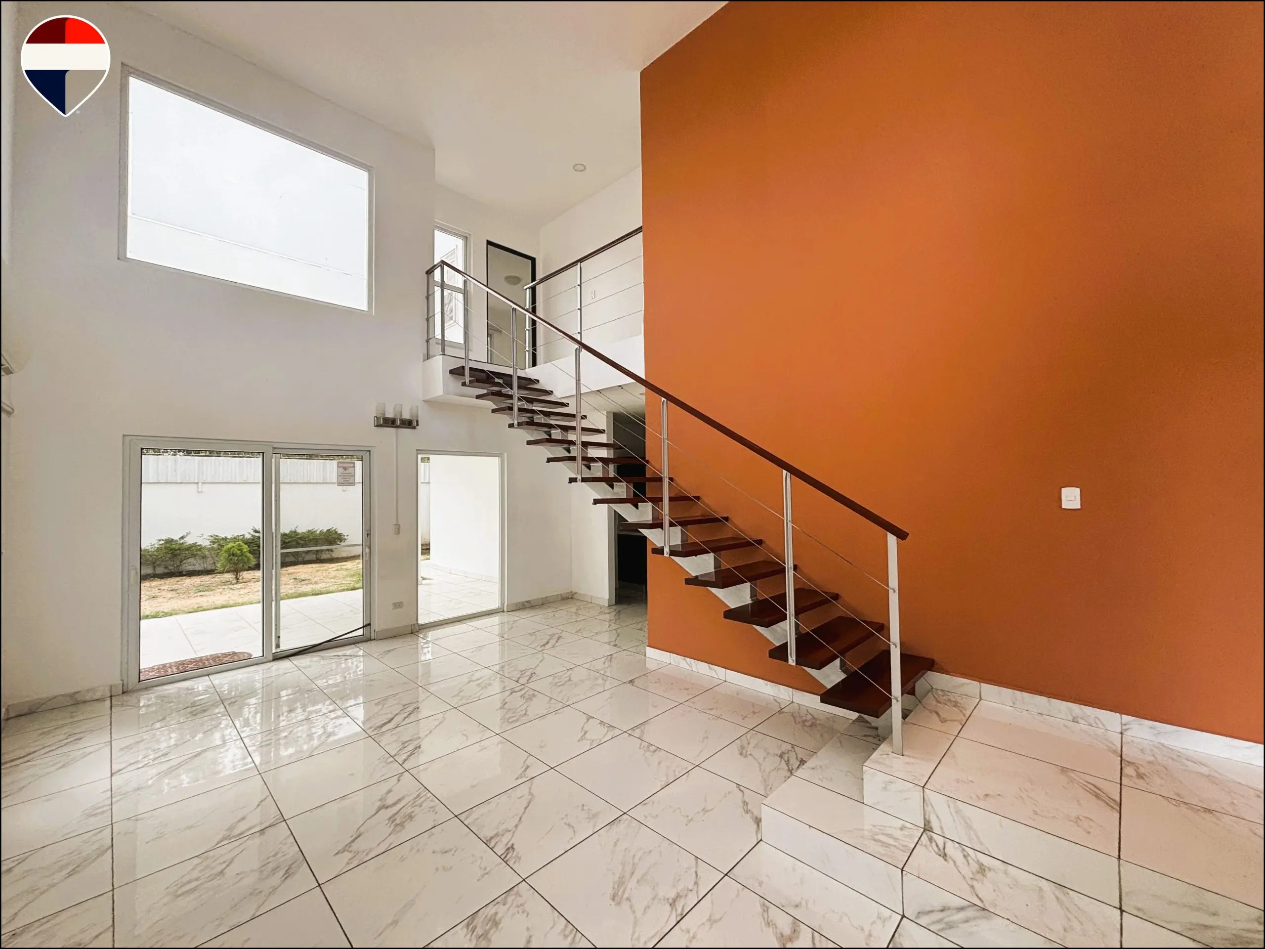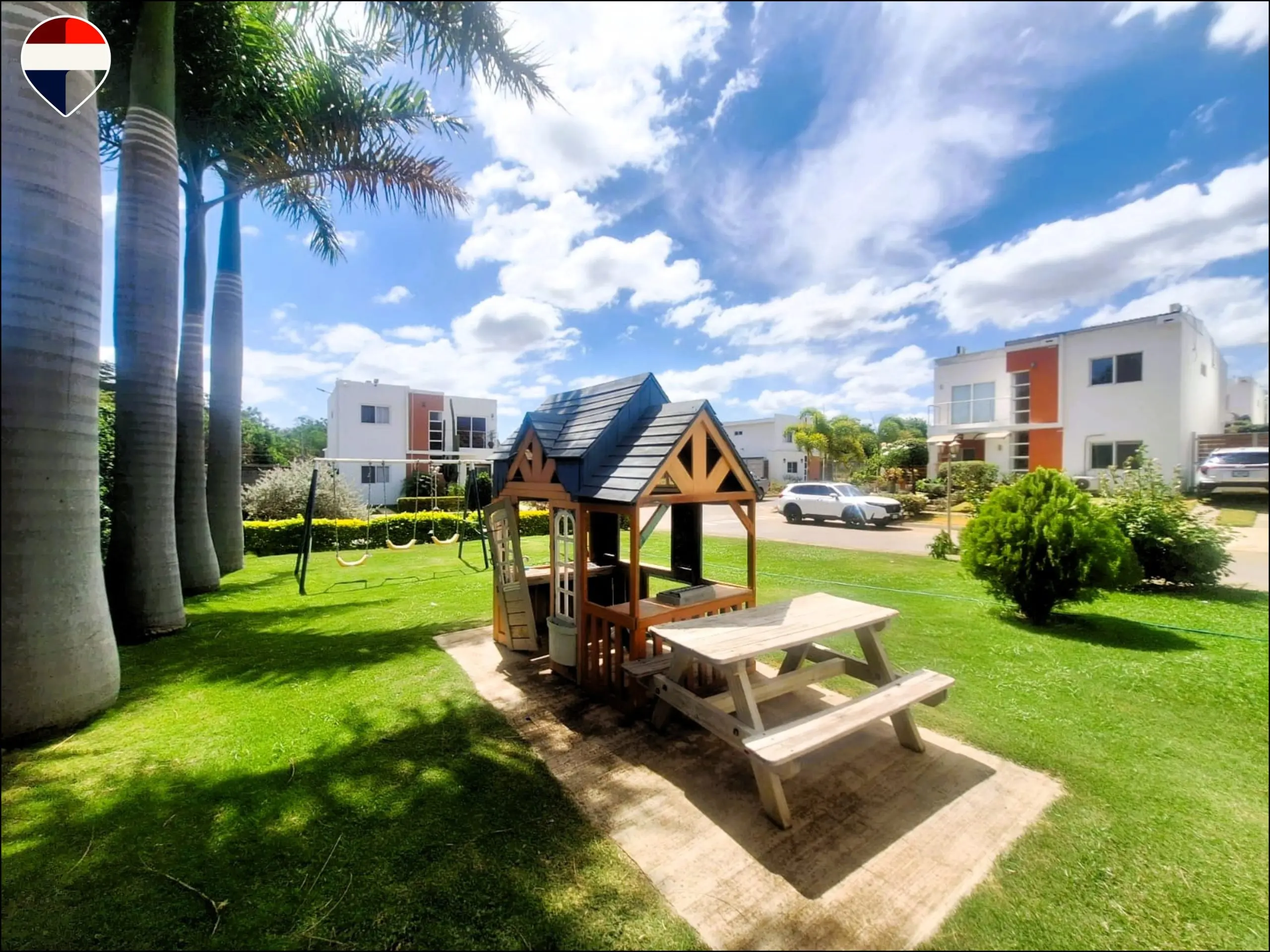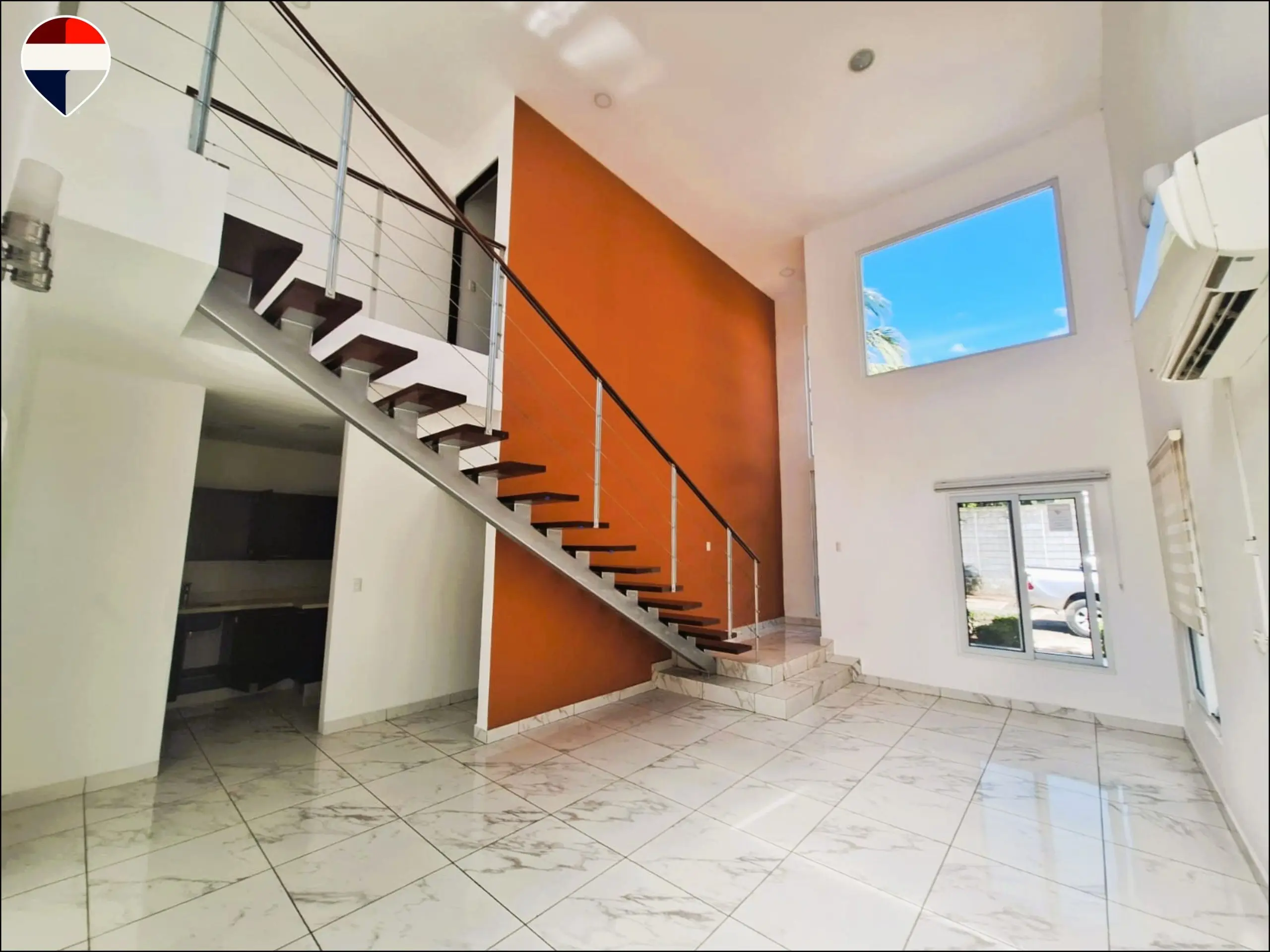 En el interior, la vivienda ofrece tres habitaciones, cada una con su baño privado y clóset. La habitación principal, ubicada en la planta baja, incluye walk-in closet, aportando mayor privacidad y confort. La distribución integra sala, comedor y cocina en un solo ambiente moderno, además de cuarto de servicio con baño propio y área de lavandería. Para mayor comodidad, dos de las habitaciones cuentan con aire acondicionado y todas las áreas incluyen abanicos de techo.
